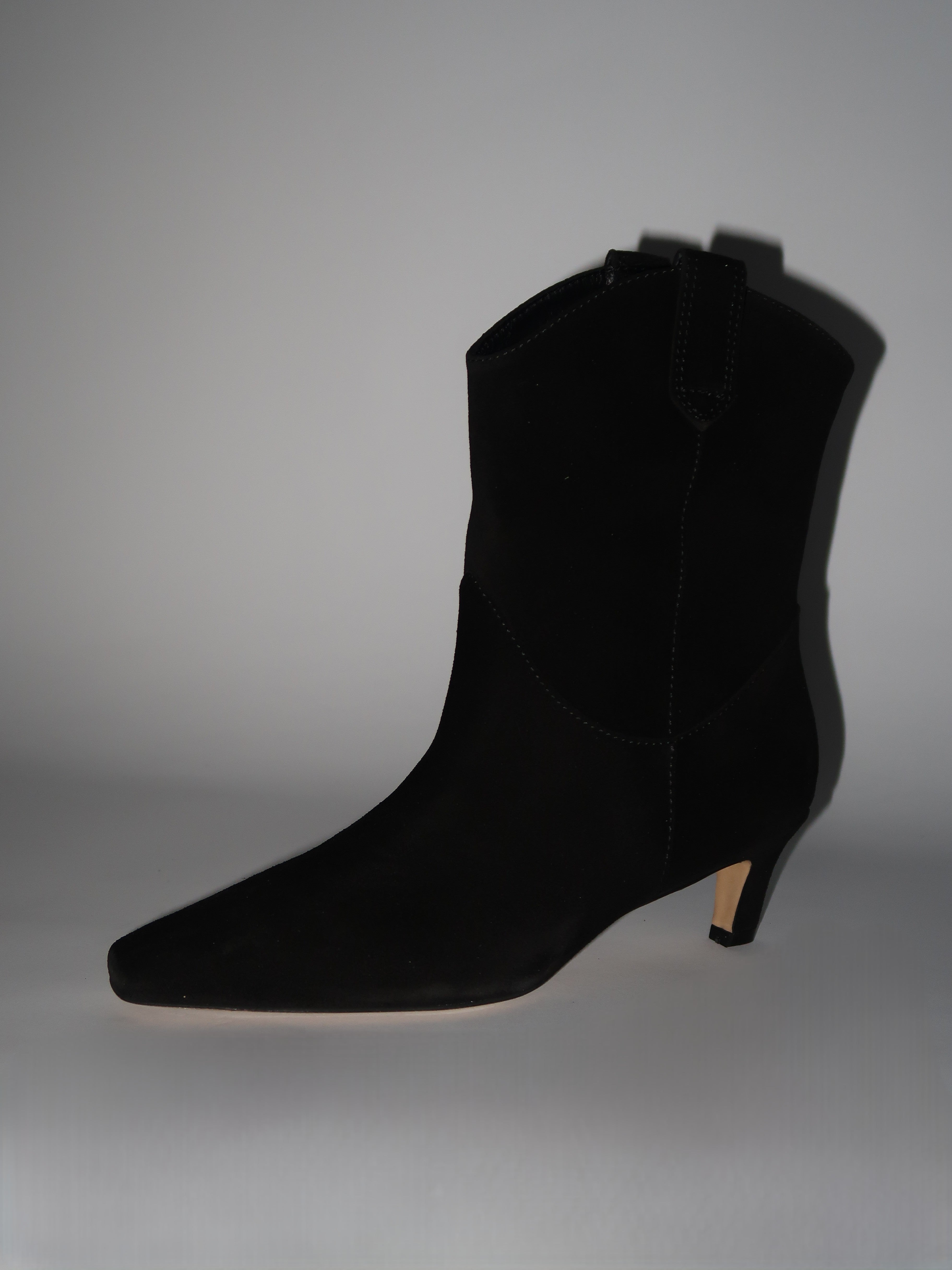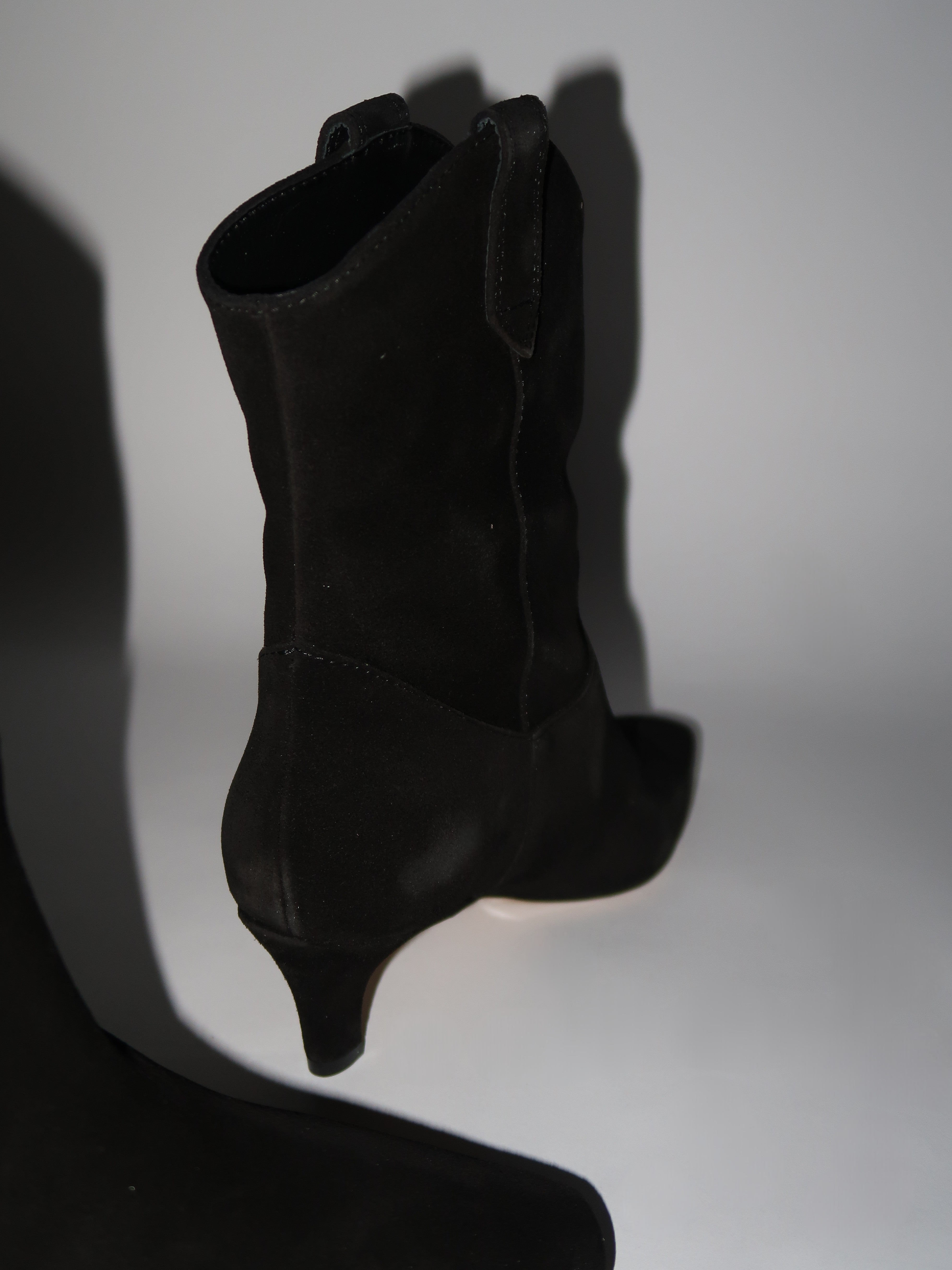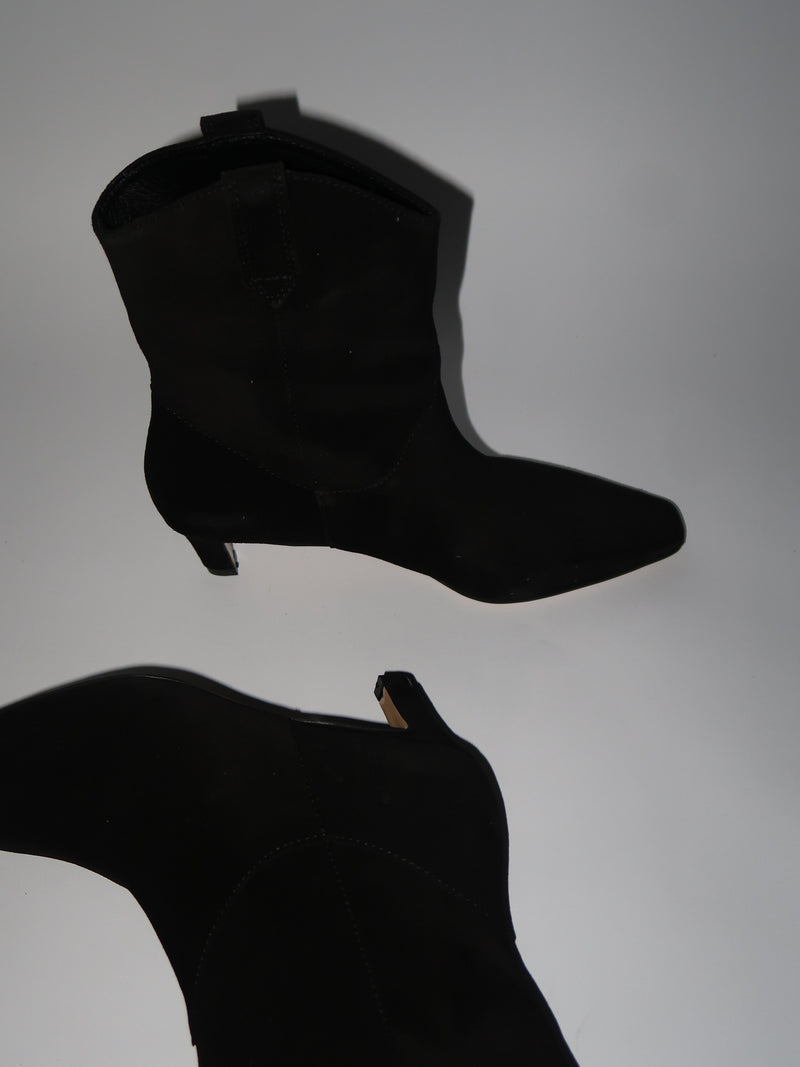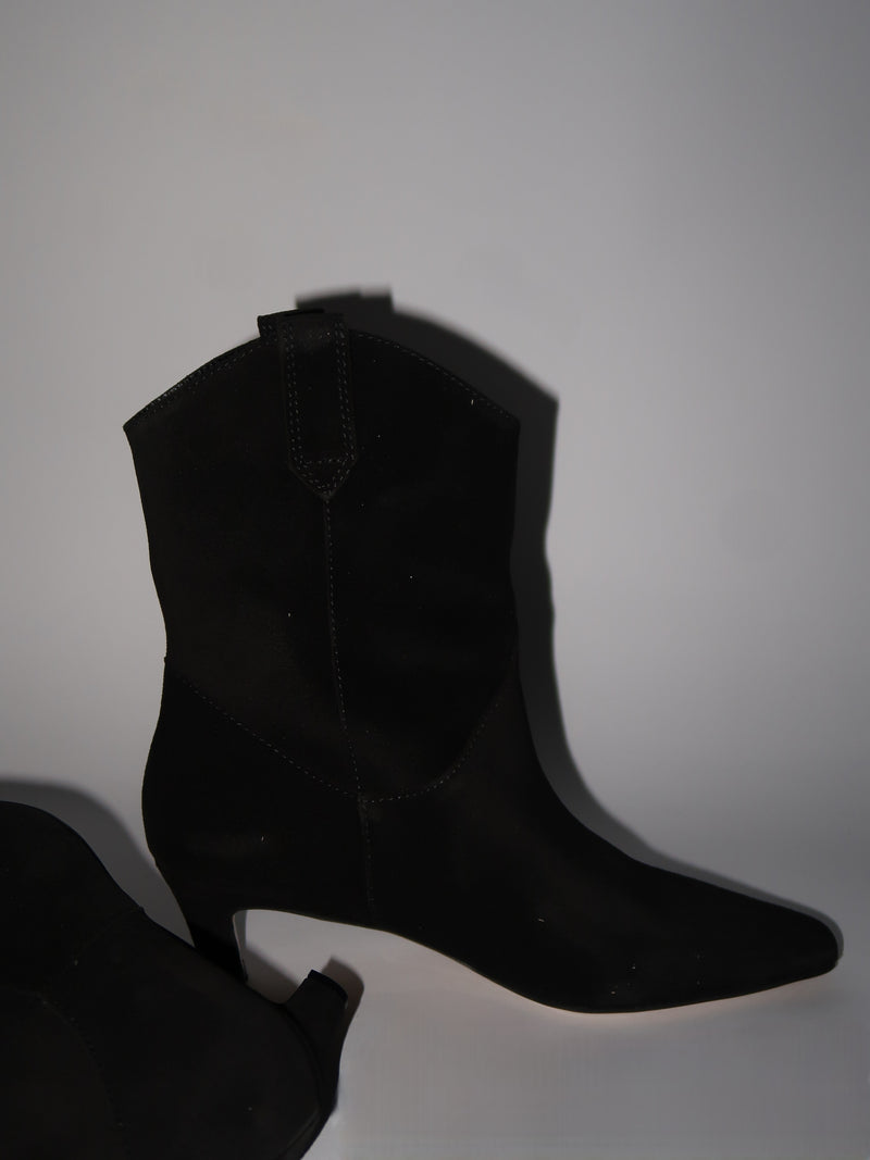 מגפונים מזמש שחור בעיצוב נקי ומעודן, עם חזית מחודדת ועקב נמוך ונוח שמעניק מראה נשי וקליל. גזרת הבוקרים והגימור הרך יוצרים שילוב מושלם בין קלאסיות לסטייל עכשווי - לזוג שמרים כל לוק בלי מאמץ.