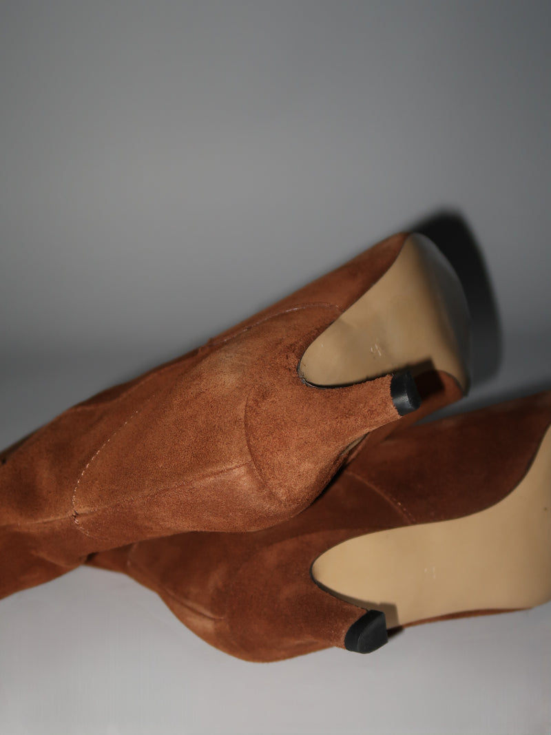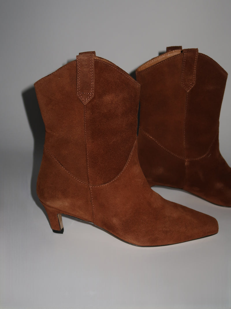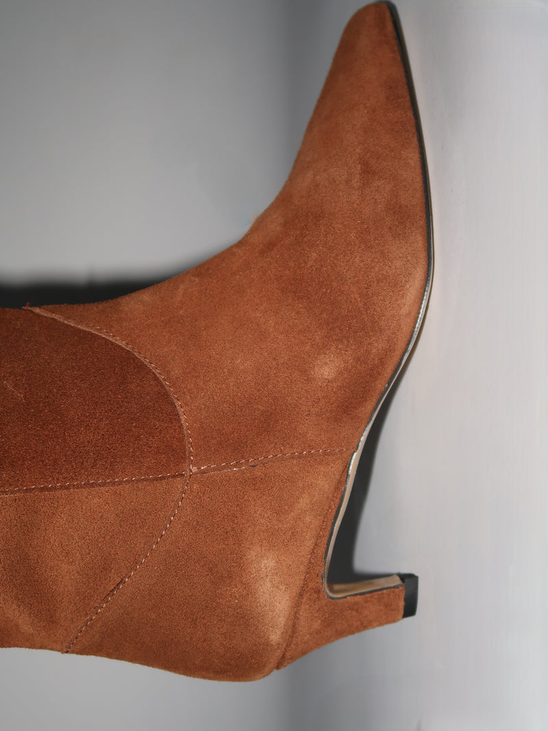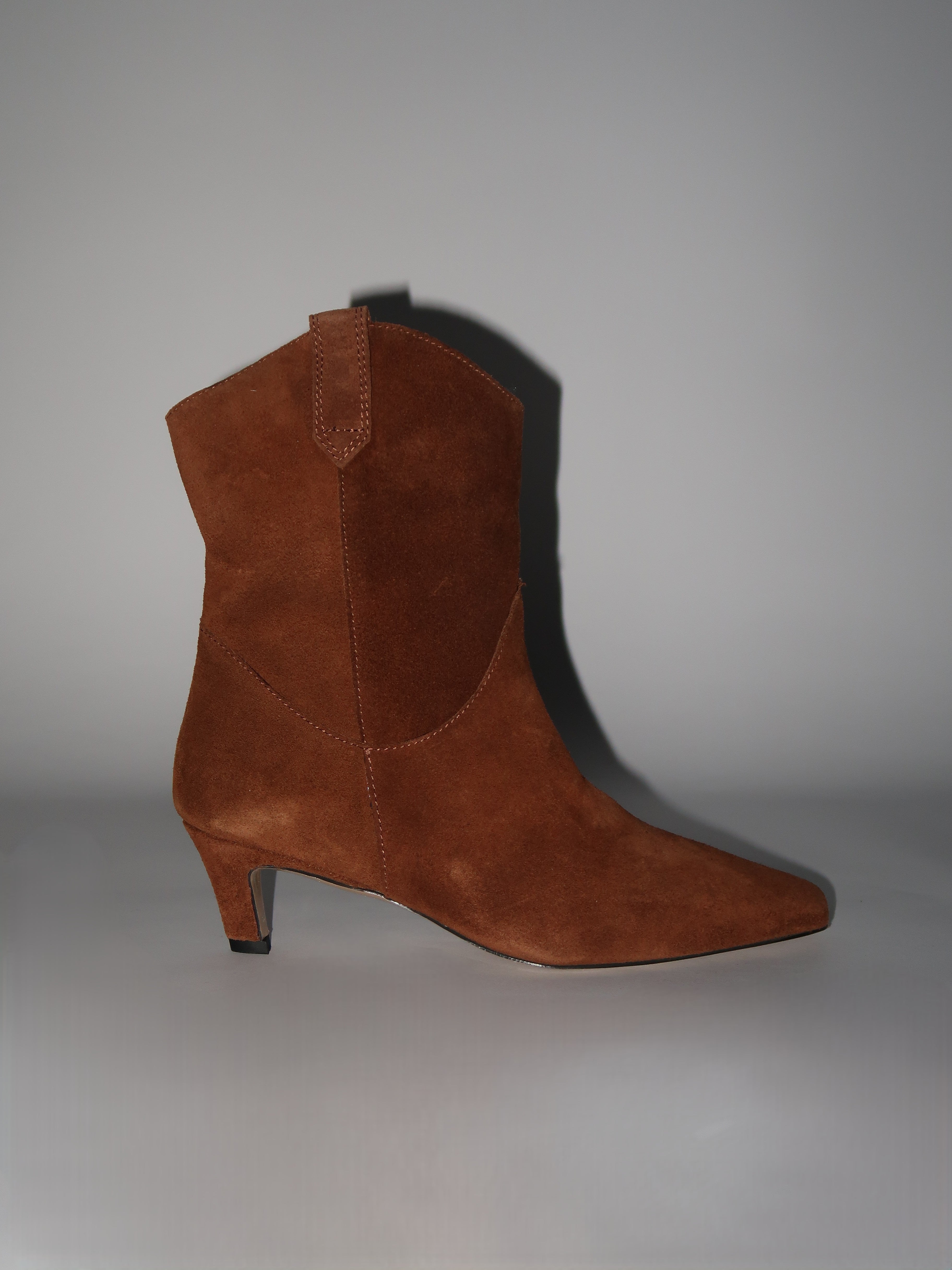 מגפונים מזמש בגוון חום בעיצוב נקי ומעודן, עם חזית מחודדת ועקב נמוך ונוח שמעניק מראה נשי וקליל. גזרת הבוקרים והגימור הרך יוצרים שילוב מושלם בין קלאסיות לסטייל עכשווי - לזוג שמרים כל לוק בלי מאמץ.