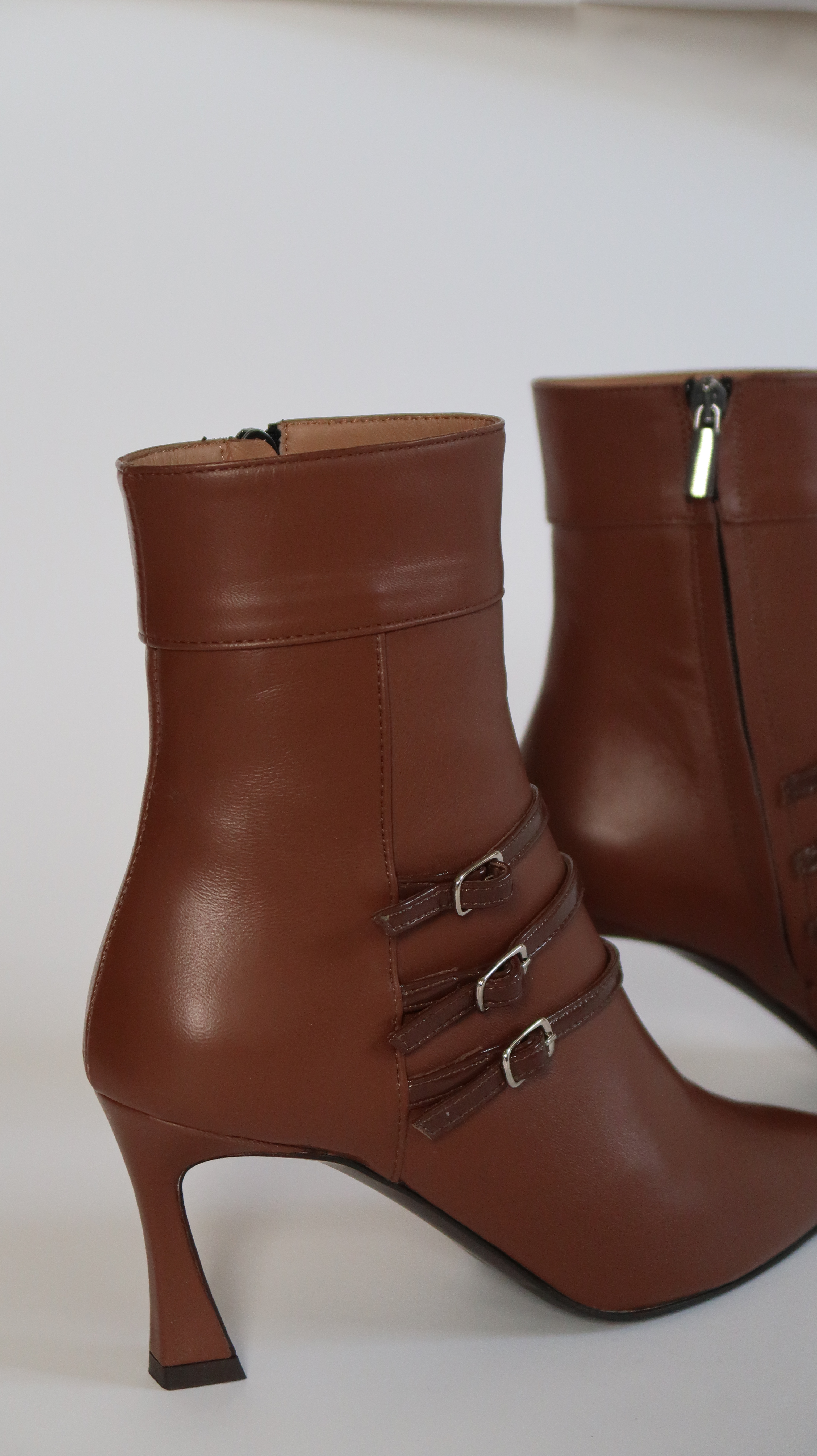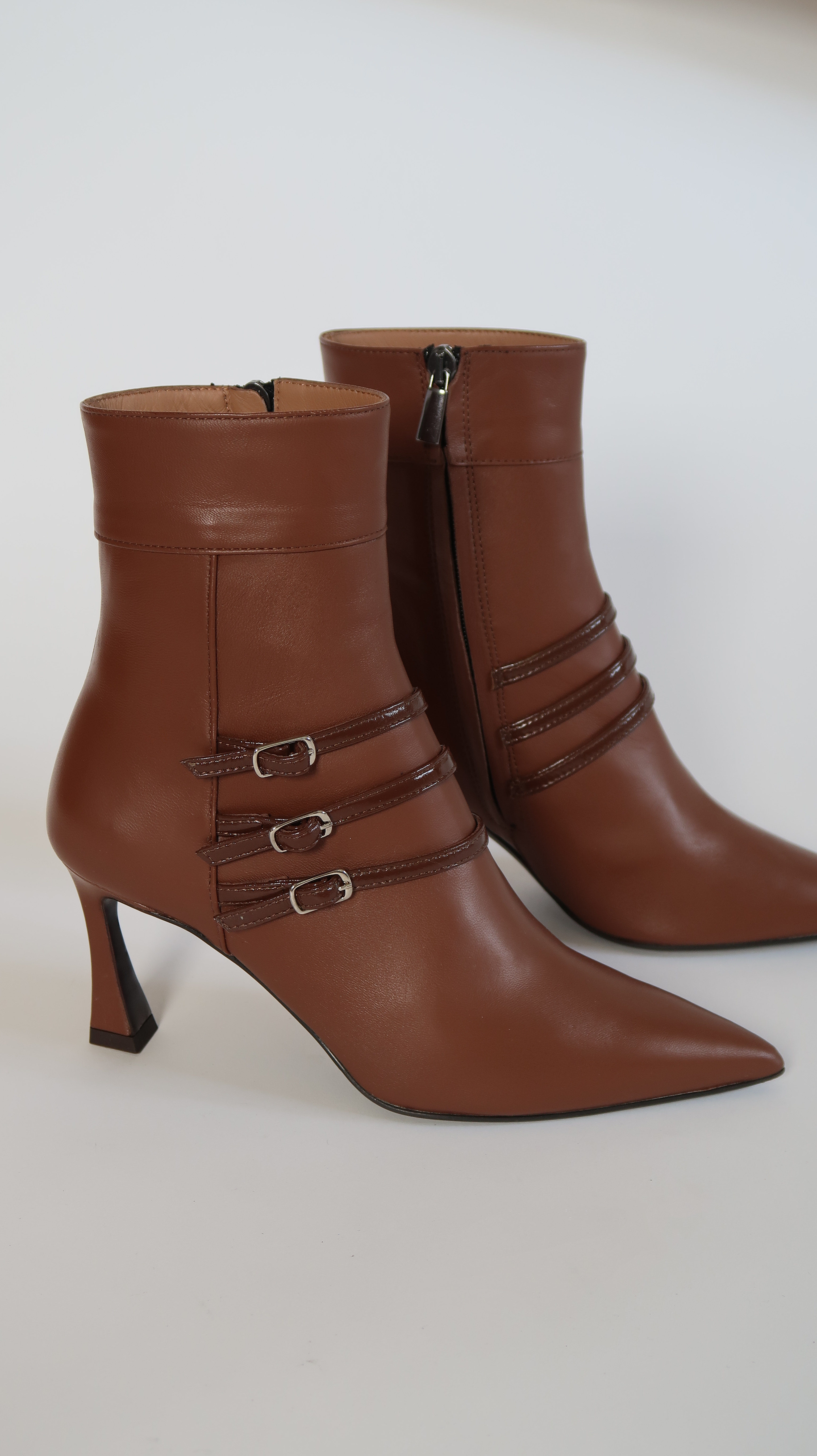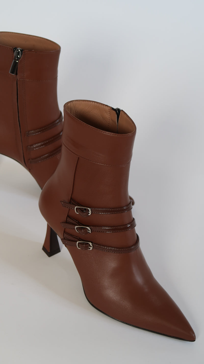 מגפונים קצרים מעור בגוון חום עם חזית מחודדת מקדימה, שלוש רצועות בעור מבריק במרכז עם אבזמים עדינים כסופים בצד. רוכסן צידי לנעילה קלה, עקב יציב בצבע תואם; קווים נקיים, מראה נשי ומעודן. דגם שמוסיף נוכחות מחויטת וקלילה .