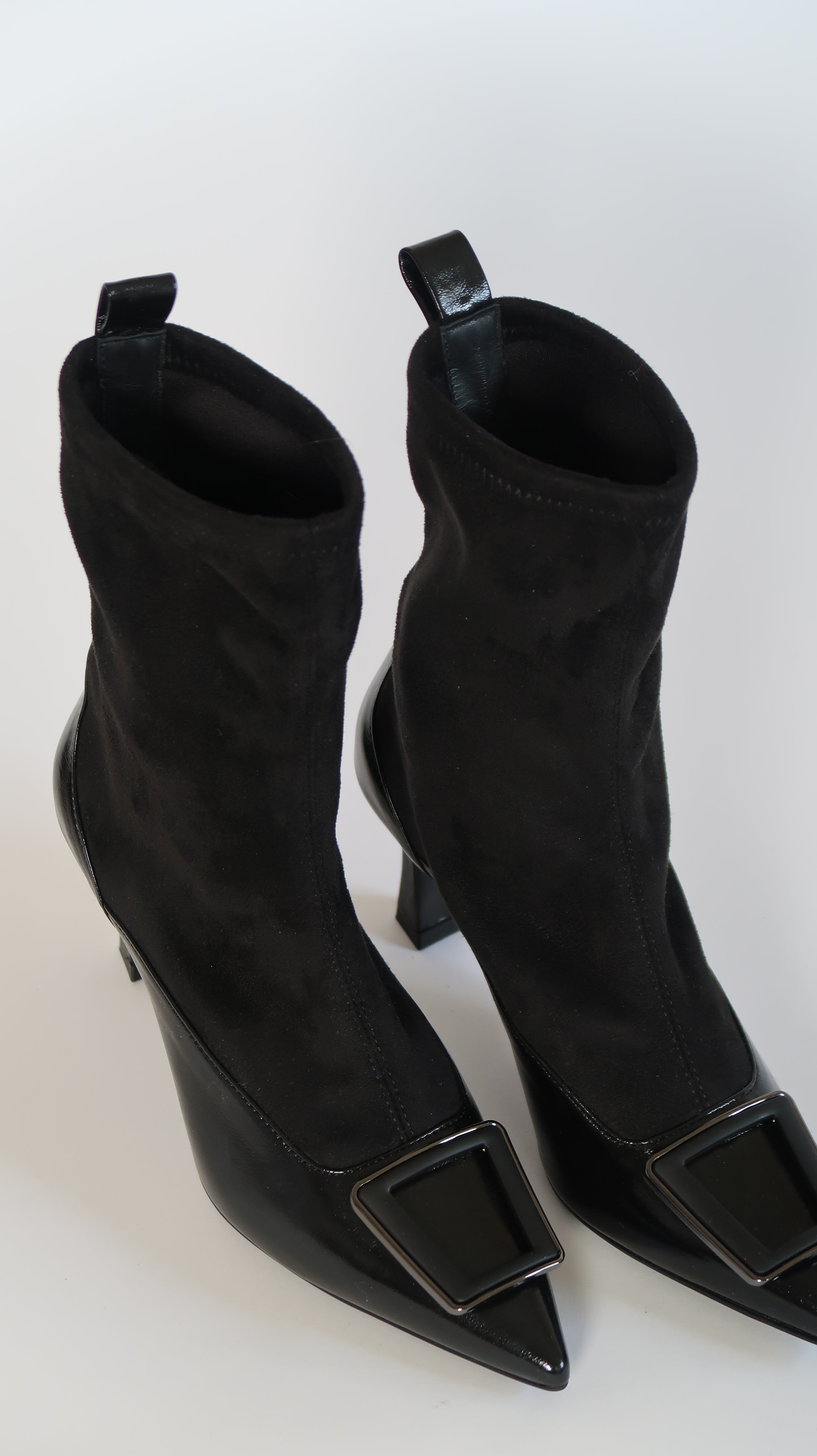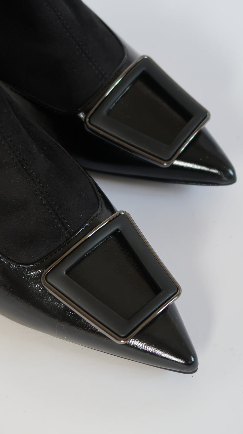 מגפונים בגוון שחור בשילוב עור מבריק וטקסטיל, גזרה מחודדת ועקב יציב שמעניקים מראה אלגנטי וחד. אלמנט גאומטרי מלבני ממוסגר בגוון כסוף, לולאת אחיזה לנעילה קלה ונוחה. החלק העליון אלסטי וצמוד לרגל להתאמה מושלמת. דגם מחמיא עם נוכחות לערבים וללוקים מינימליסטיים.