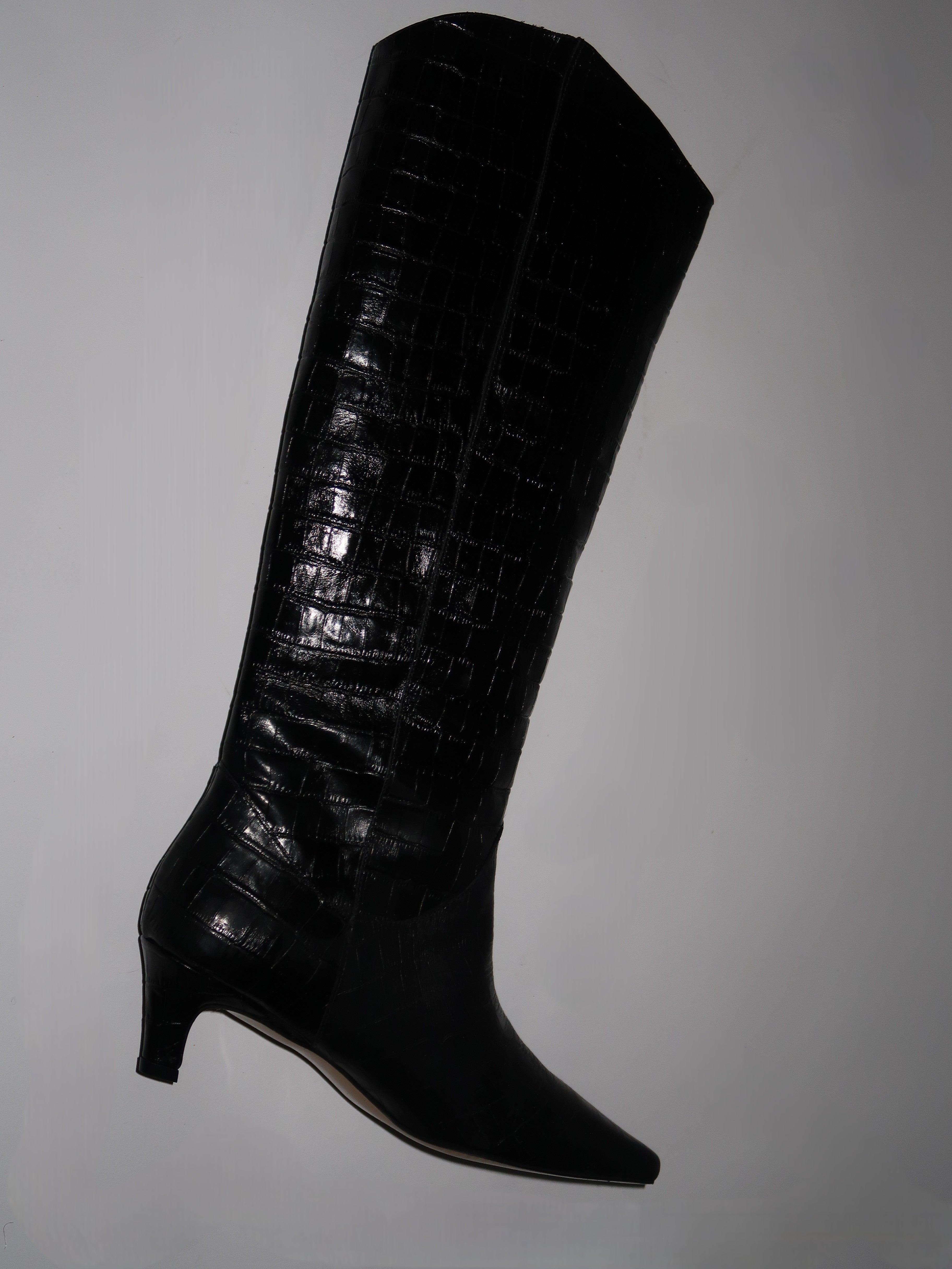 מגפיים גבוהים מעור בצבע שחור בטקסטורת קרוקו, עם עקב נמוך וחזית מחודדת המעניקה מראה אלגנטי ונקי. הגזרה שלהם שומרת על מראה קלאסי ונינוח, ומתאימה בקלות גם לשמלה וגם לג’ינס - בחירה מדויקת לעונה.