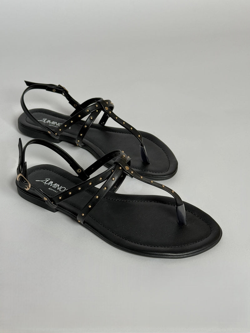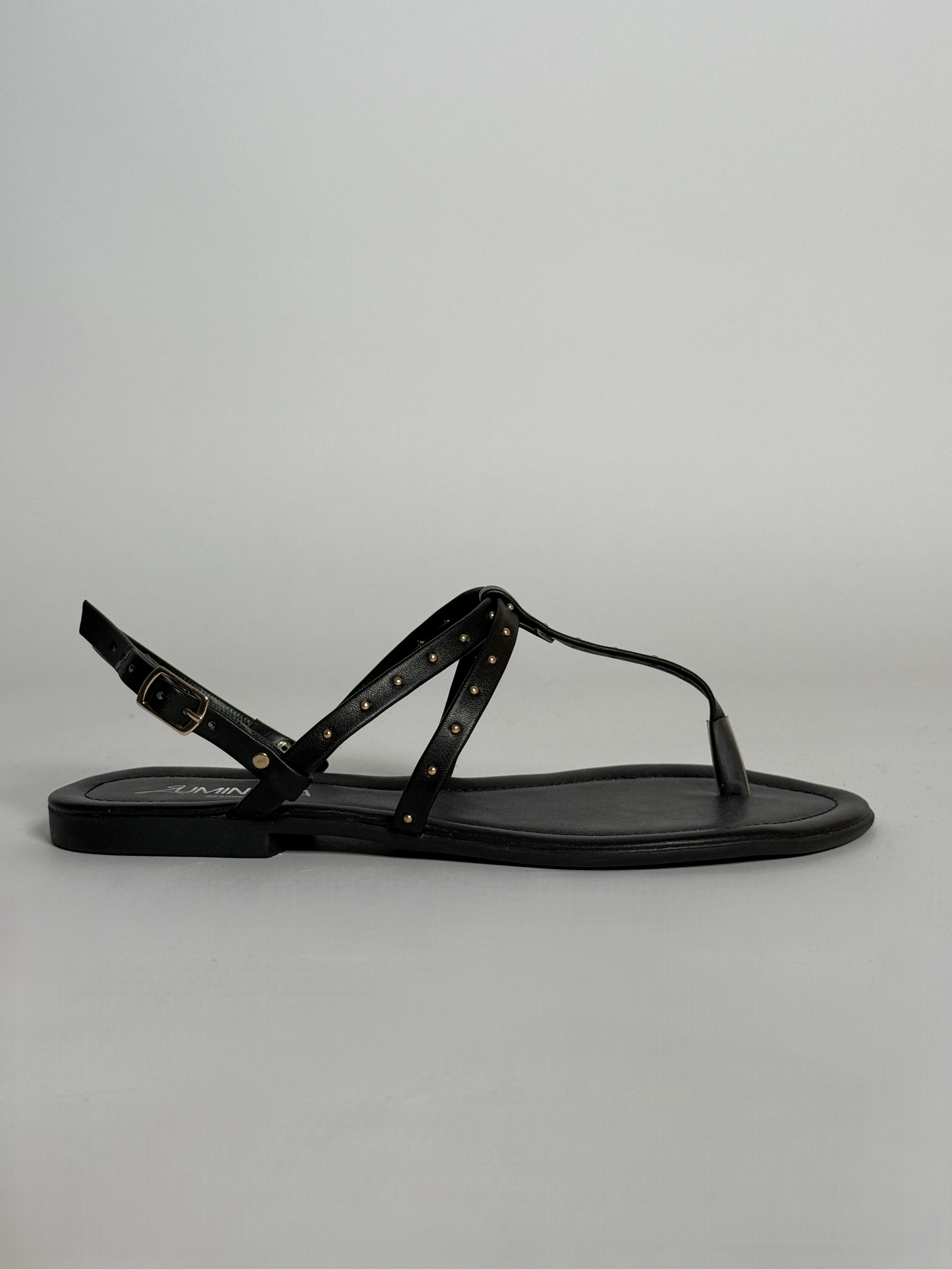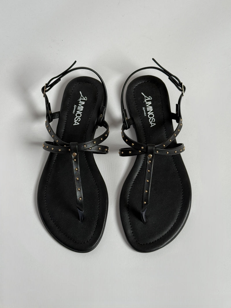 סנדלי שטוחים בעיצוב טרנדי ואלגנטי בצבע שחור. הדגם כולל רצועות דקות ומצטלבות בסגנון T המקיפות את כף הרגל ויוצרות מראה נשי ומוקפד. הרצועות מעוטרות בניטים קטנים בגוון זהב שמוסיפים טאץ' אופנתי וזוהר, מבלי לוותר על מראה מינימליסטי ונקי.