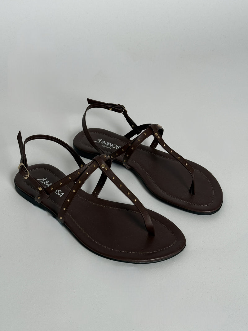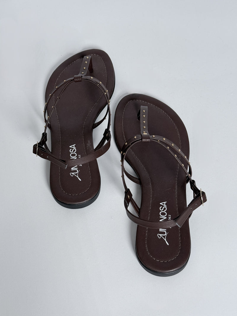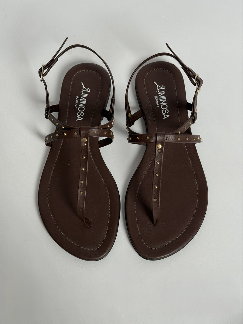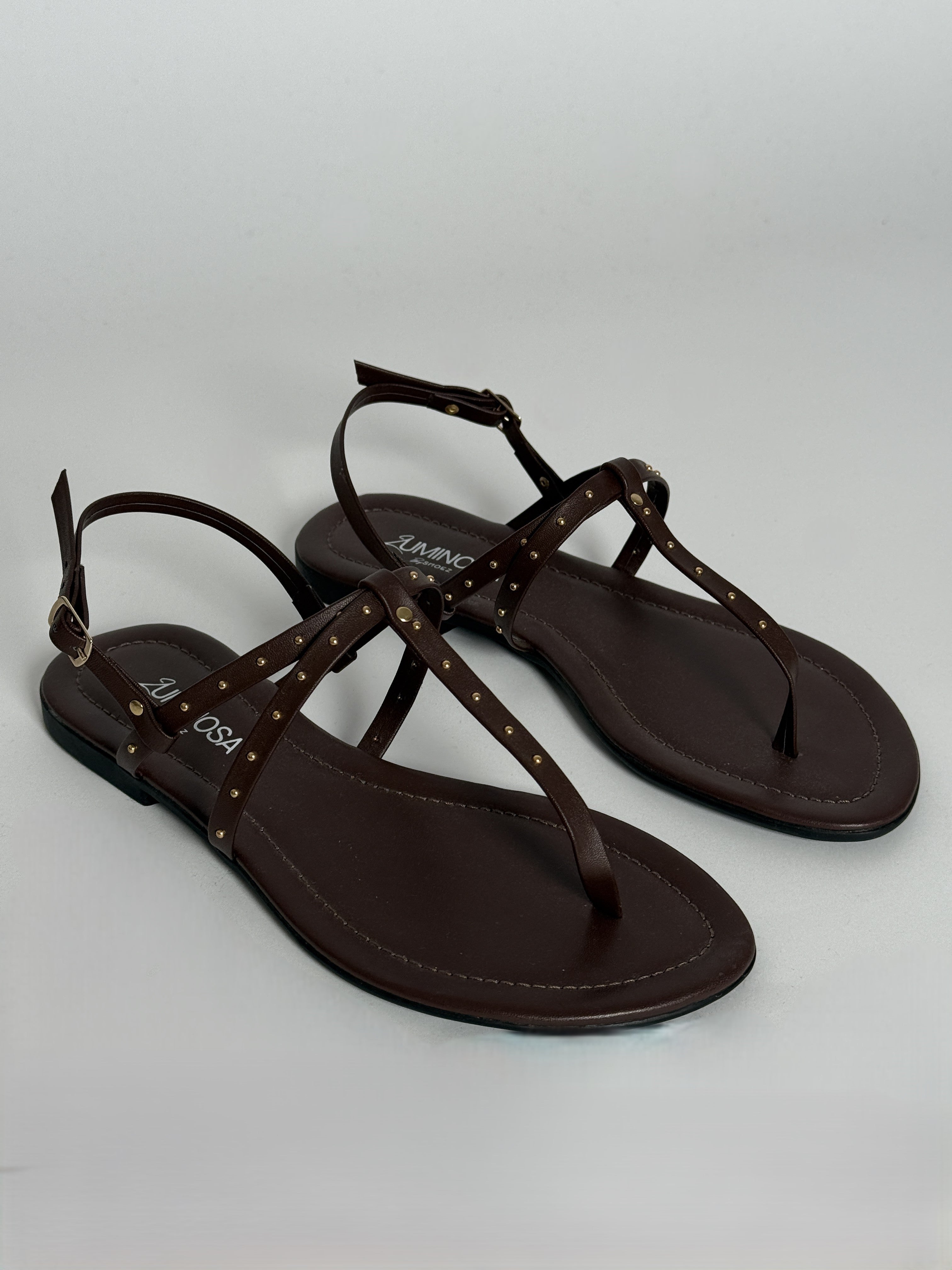 סנדלי שטוחים בעיצוב טרנדי ואלגנטי בצבע חום שוקולד. הדגם כולל רצועות דקות ומצטלבות בסגנון T המקיפות את כף הרגל ויוצרות מראה נשי ומוקפד. הרצועות מעוטרות בניטים קטנים בגוון זהב שמוסיפים טאץ' אופנתי וזוהר, מבלי לוותר על מראה מינימליסטי ונקי.