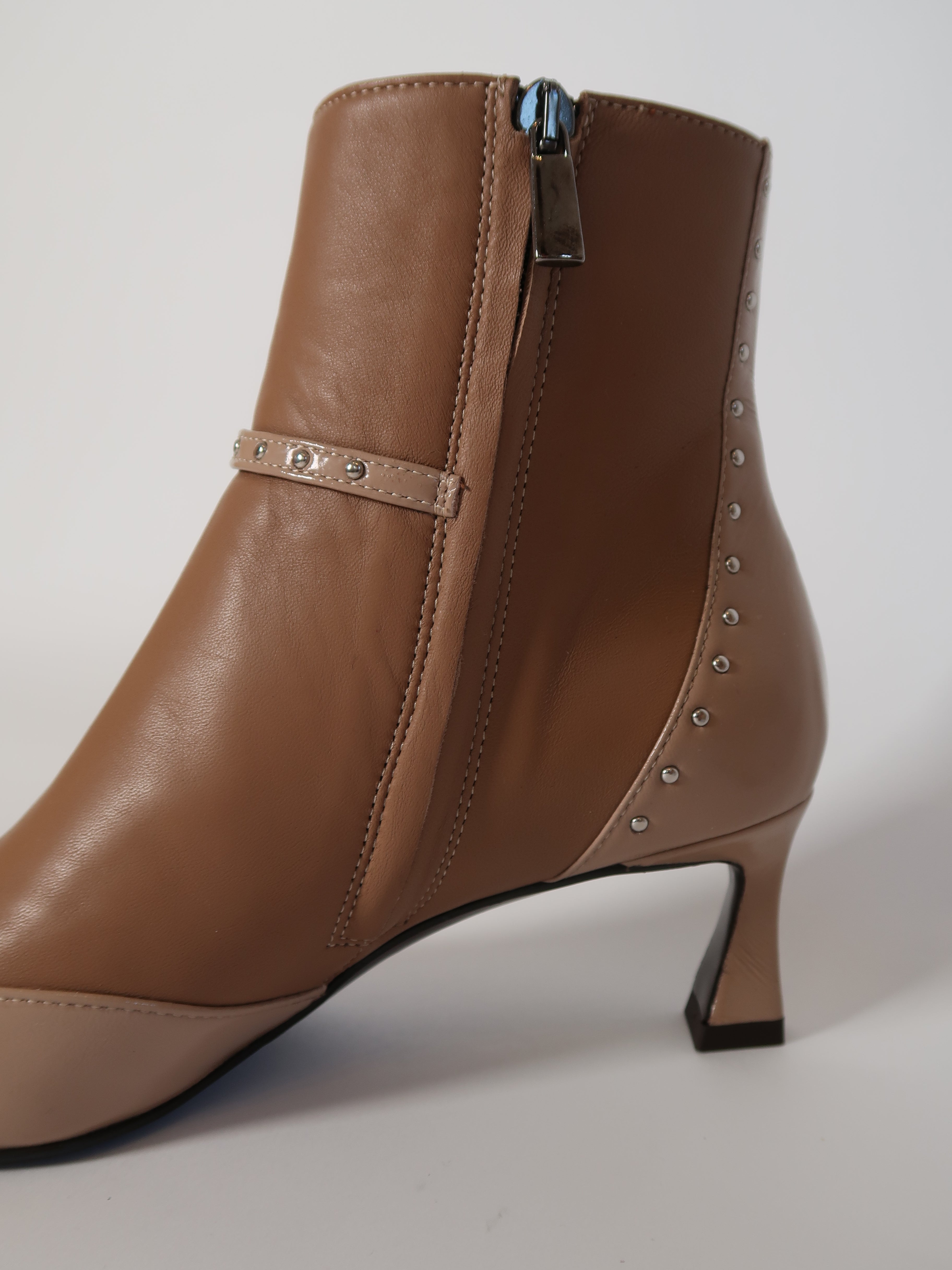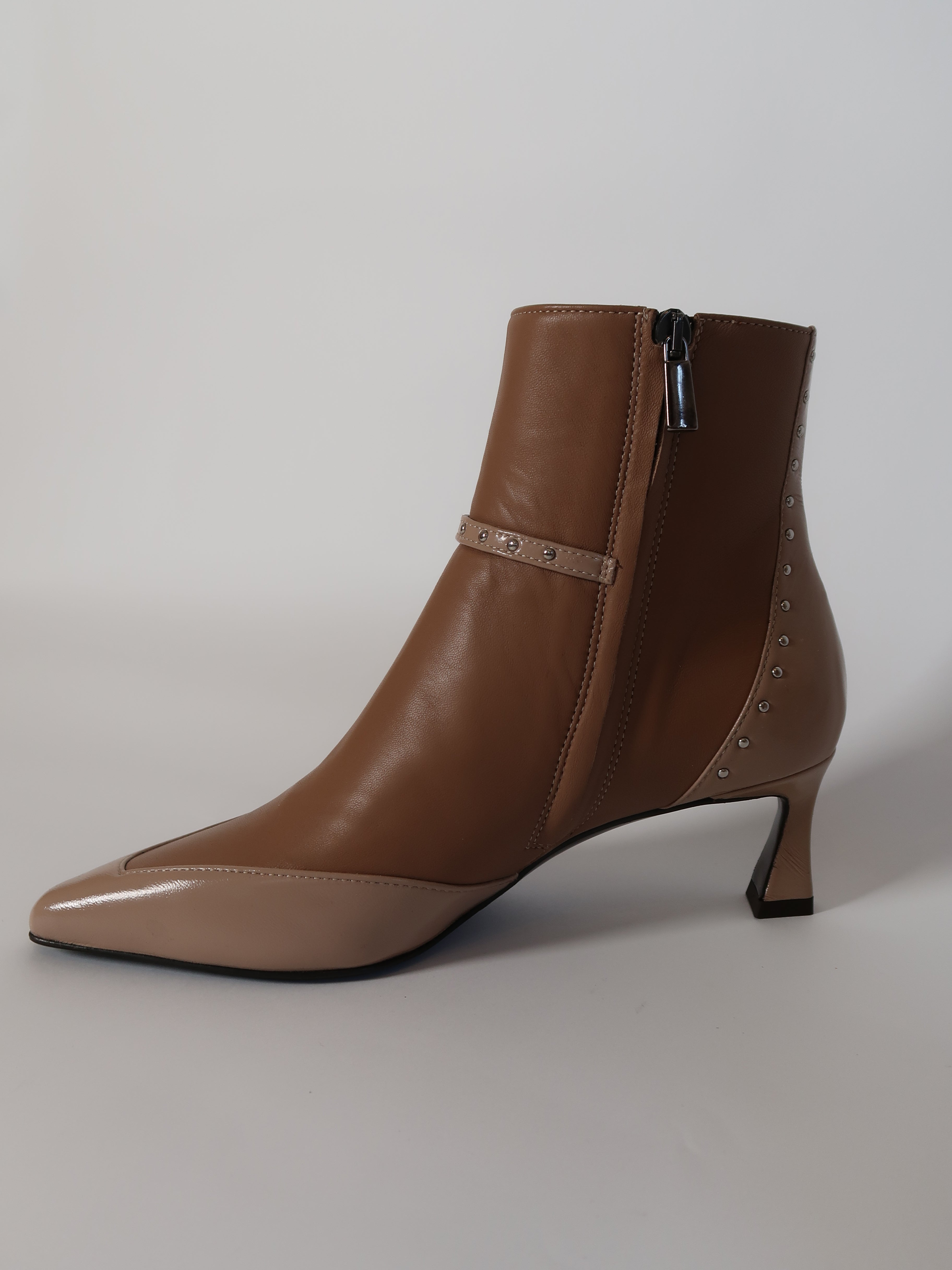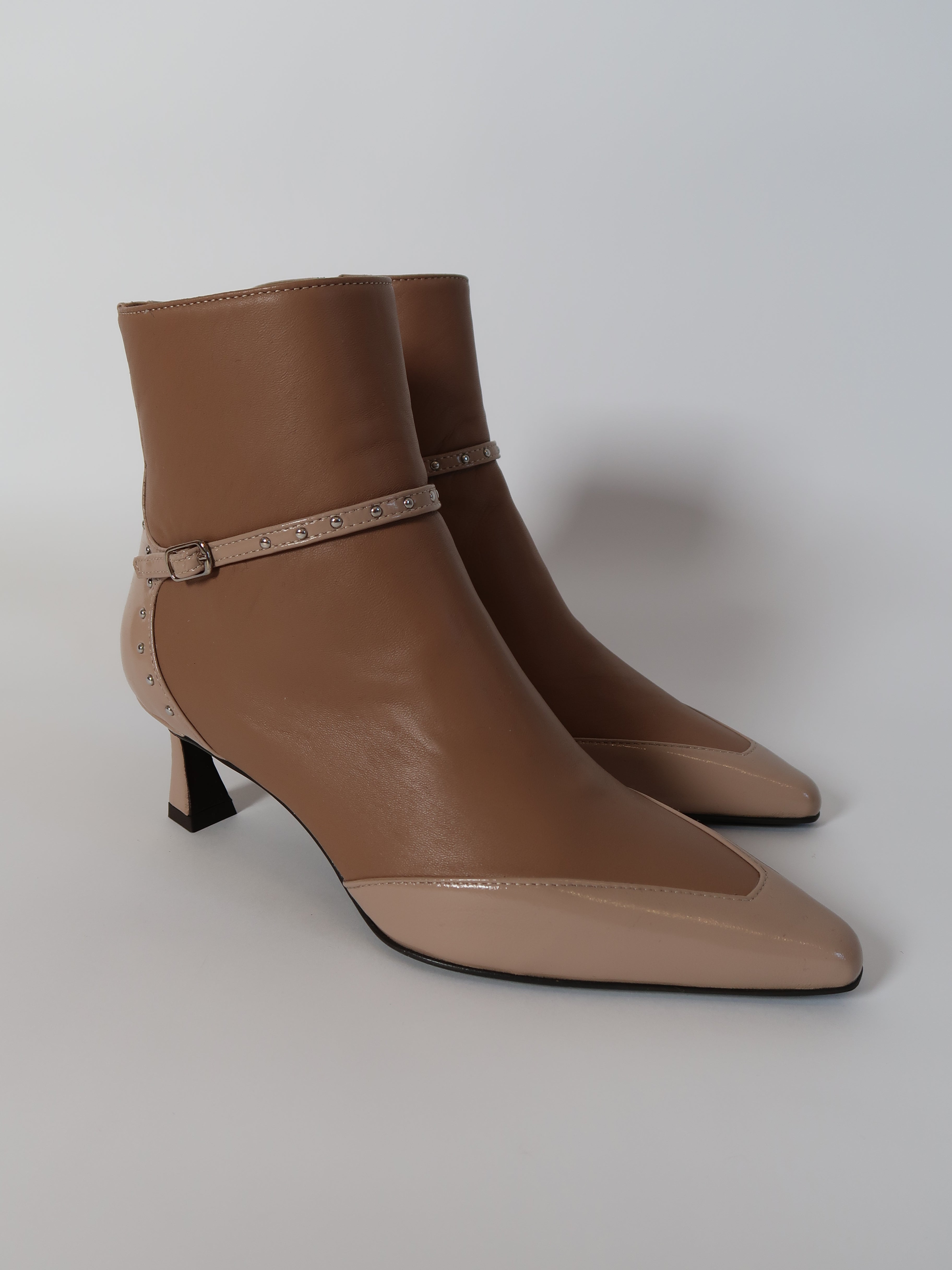 מגפונים מעור בגובה קרסול בשילוב שני גווני ניוד. רצועה דקה במרכז ואבזם עדין בצבע כסף. חזית קדמית מחודדת ומעוטרת ניטים קטנים כסופים המעניקים טוויסט עדין למראה האלגנטי. הגזרה המחמיאה והעקב המדויק ישתלב לך במראה מחויט או ליציאה בערב.