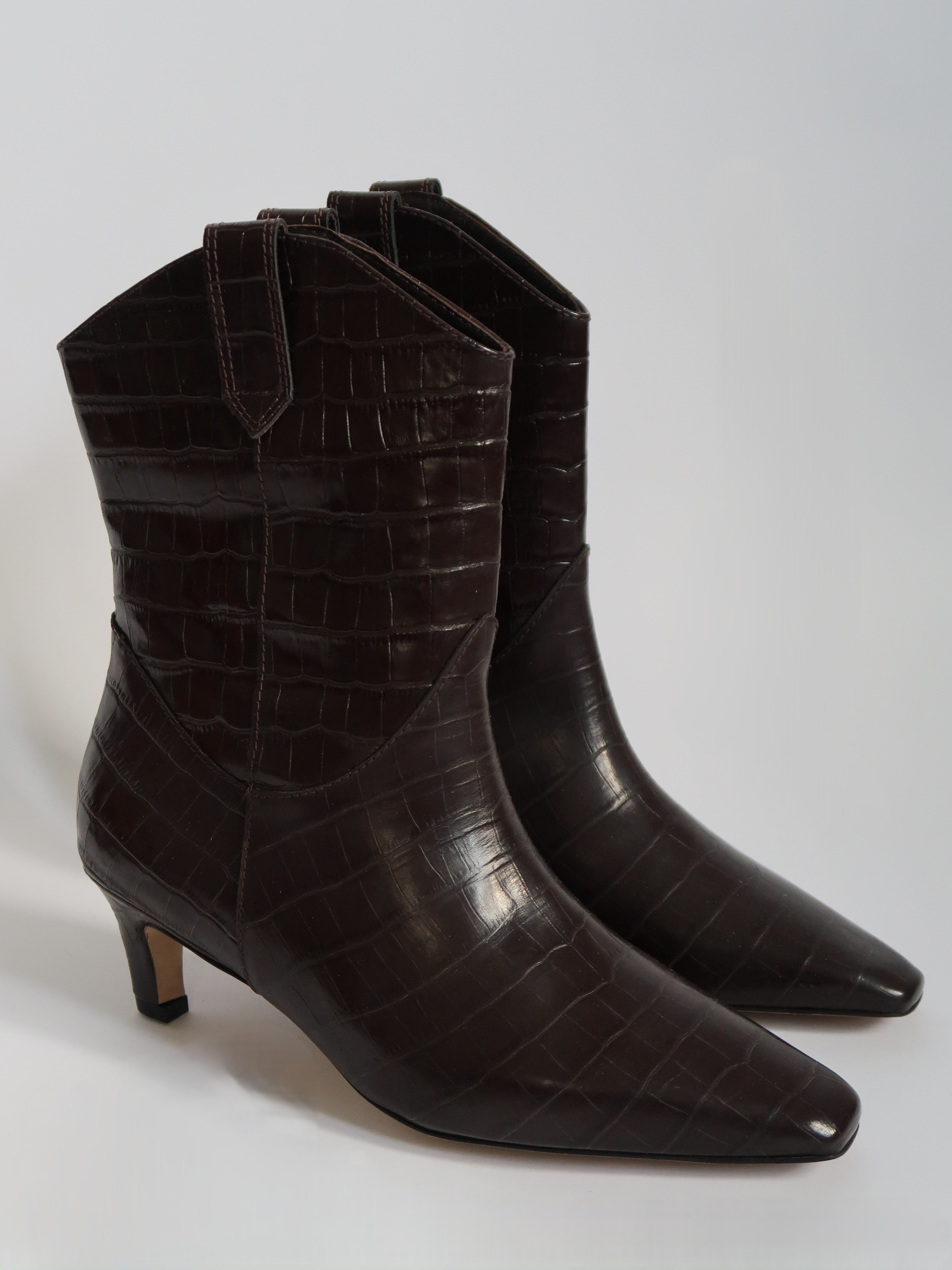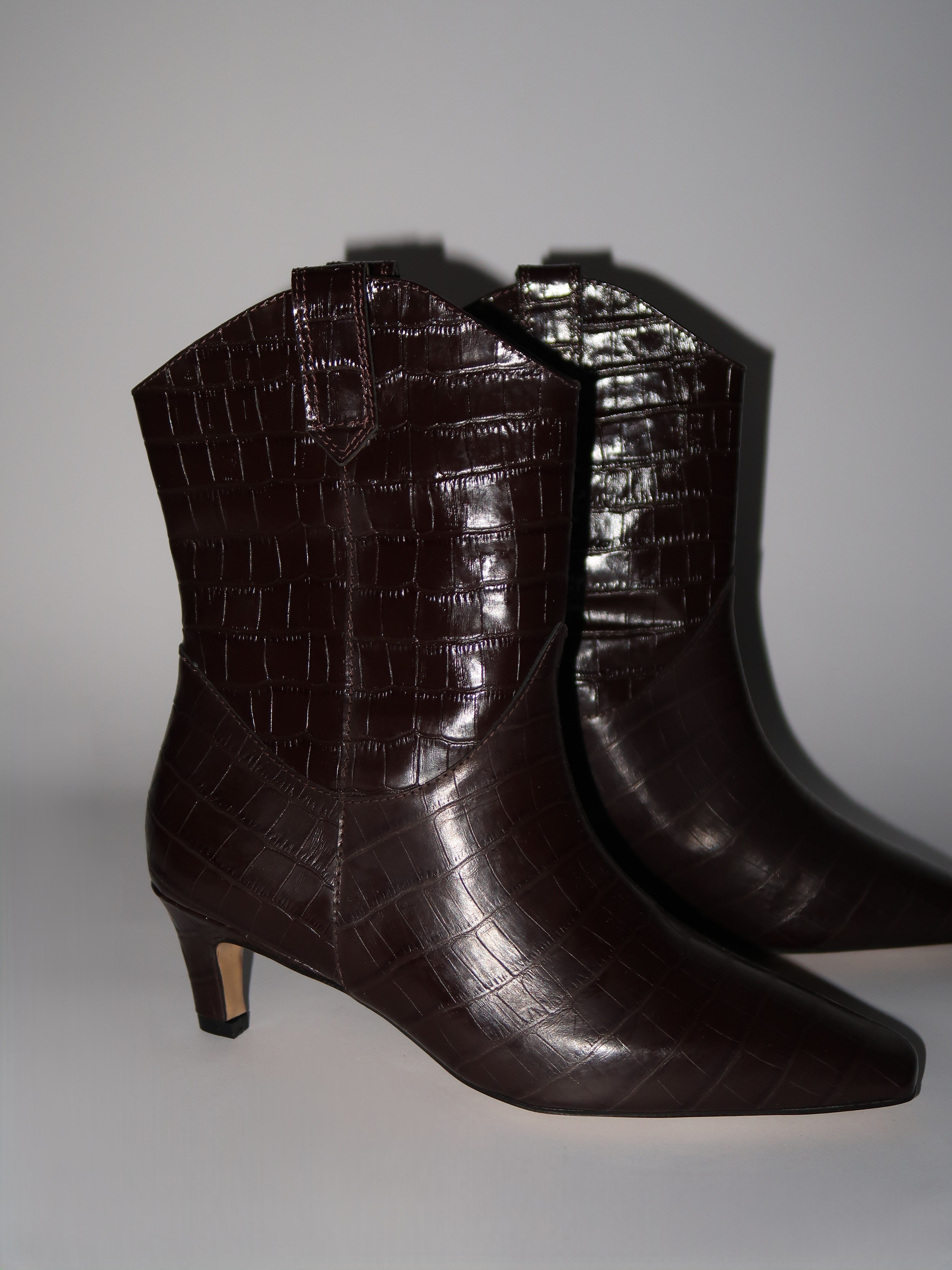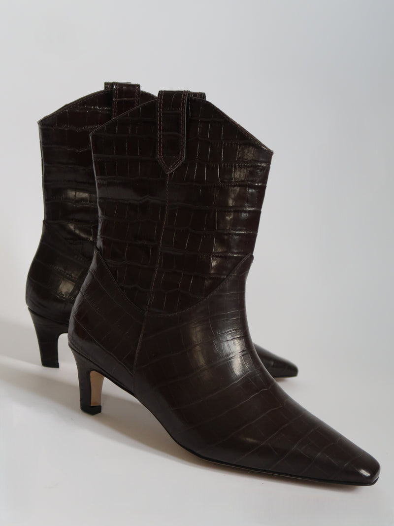 מגפונים מעור בצבע חום בגימור קרוקו מבריק, עם עקב דק וחזית מחודדת שמוסיפים טוויסט מדויק לכל לוק. שילוב של נוחות וסטייל עם נוכחות עדינה, בדיוק במידה הנכונה.