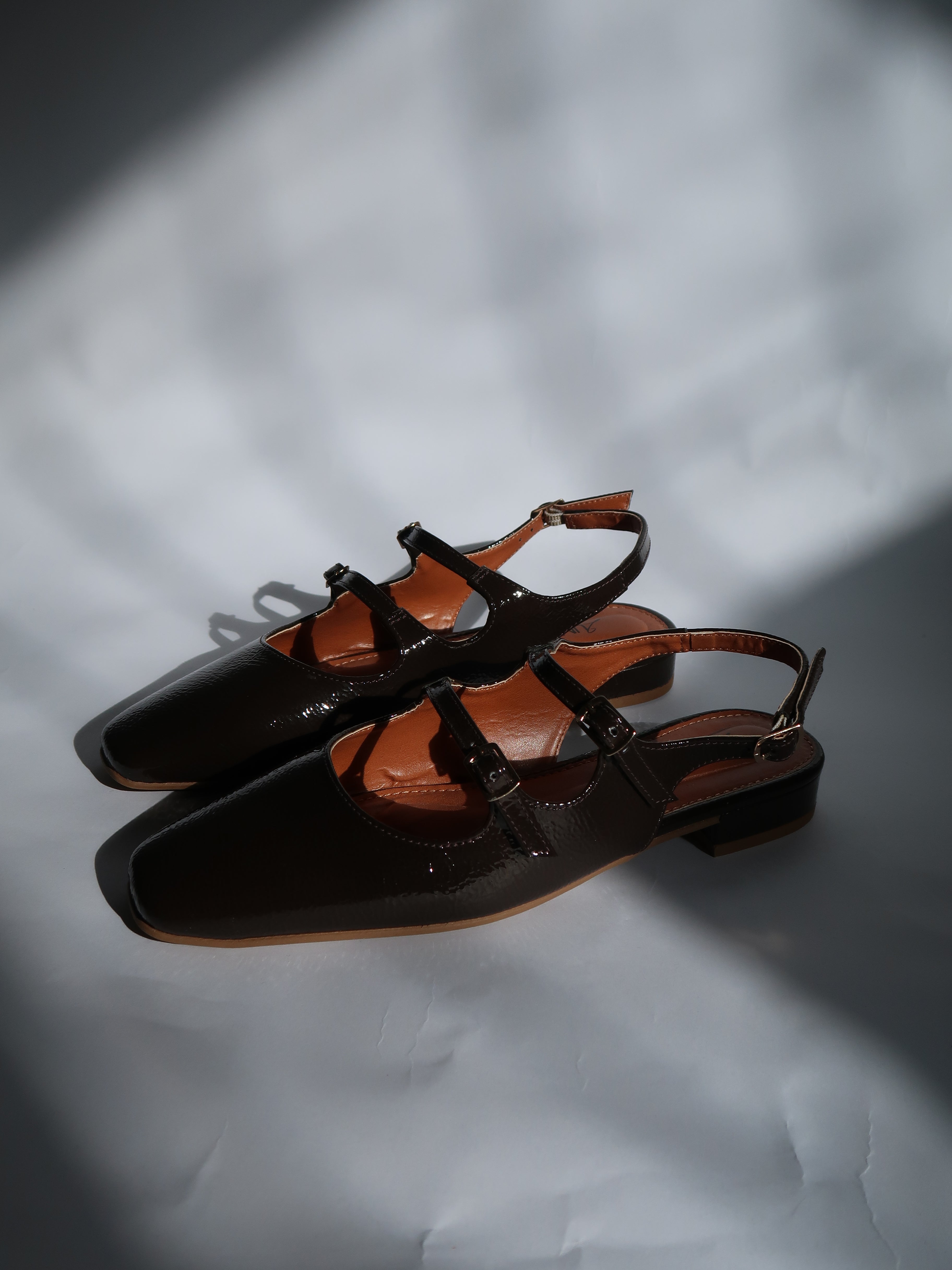 נעלי סירה שטוחות בצבע חום כהה מבריק עם שתי רצועות בצבע תואם עם אבזמים בצבע כסף ורצועת עקב אחורית. קלאסיות ועל זמניות